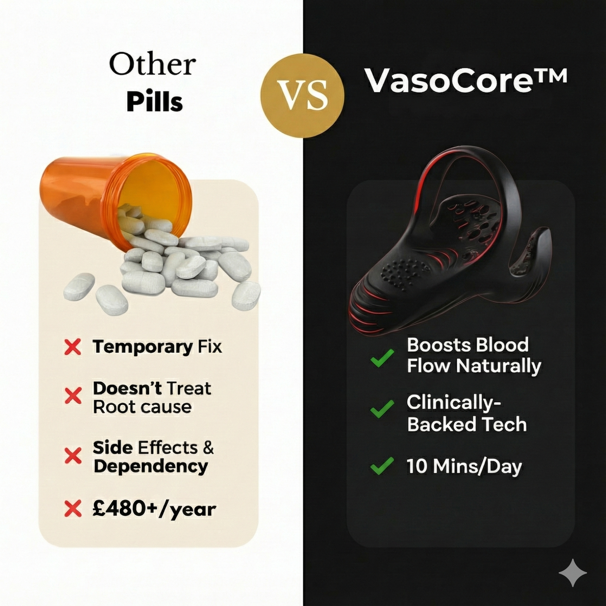 Pills force blood flow temporarily then wear off. They don't fix anything - they mask the symptom. VasoCore™ treats the root cause by rebuilding blood vessel health and restoring nerve response. Over time, your body starts working on its own again.