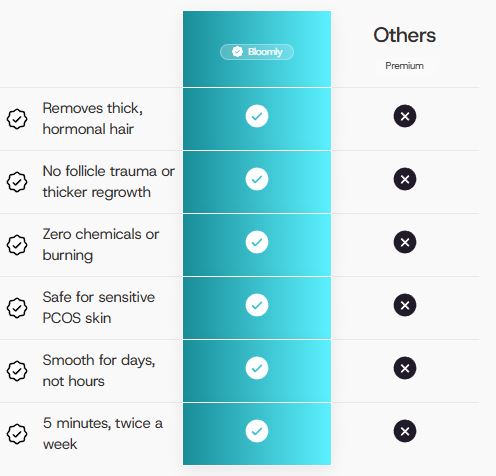 Razors cut hair bluntly, leaving you with stubble by noon. Creams are full of harsh chemicals that burn sensitive PCOS skin — and you wait 10 minutes smelling awful. Bloomly's floating head removes hair cleanly at the surface without trauma or chemicals. Smooth for days, not hours.